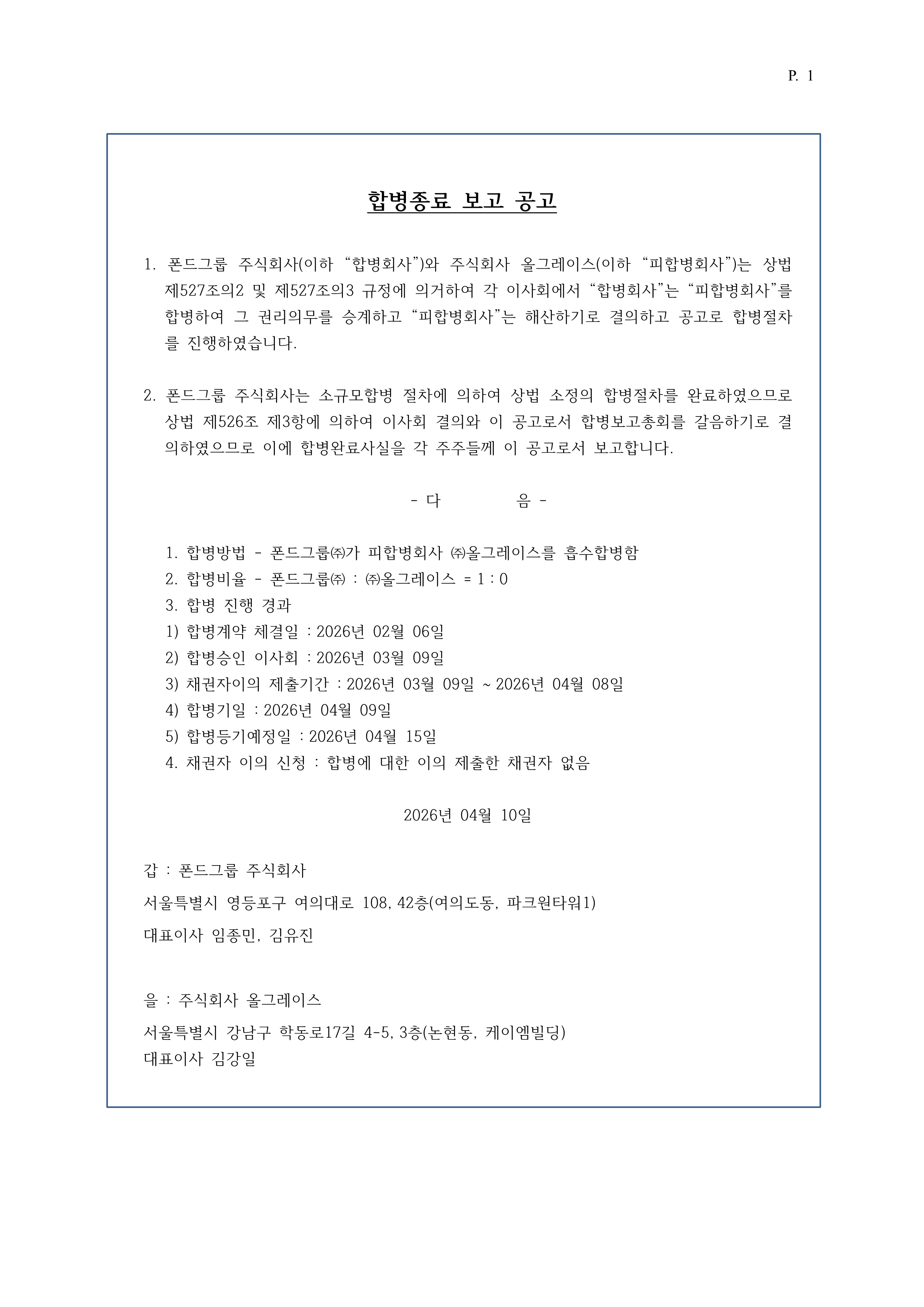 [폰드그룹] 합병종료 보고 공고 (폰드그룹-올그레이스)