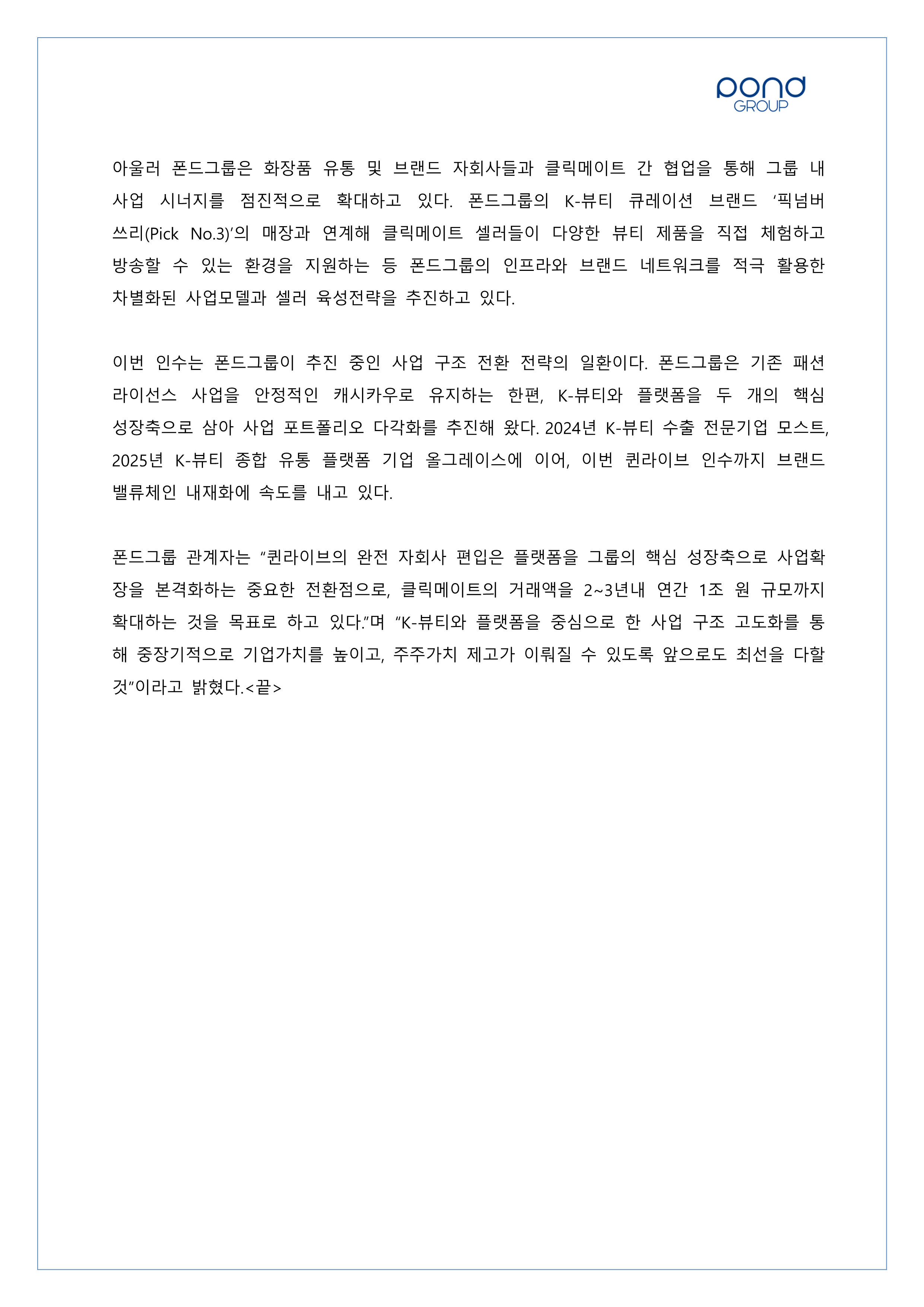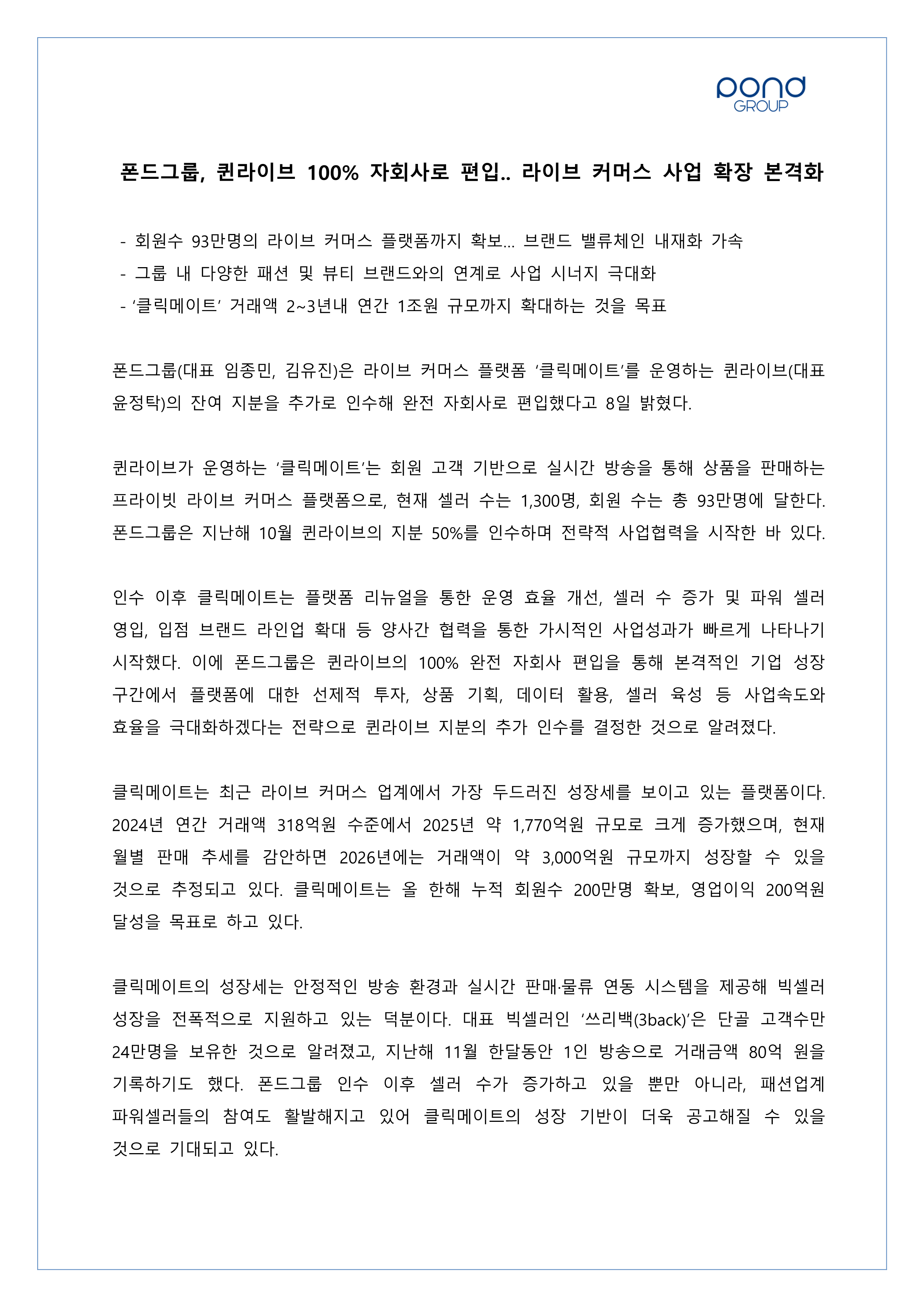 [폰드그룹] 퀸라이브 100% 자회사로 편입.. 라이브 커머스 사업 확장 본격화
