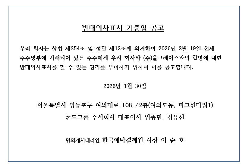 [폰드그룹-올그레이스] 소규모합병 반대의사표시 기준일 공고