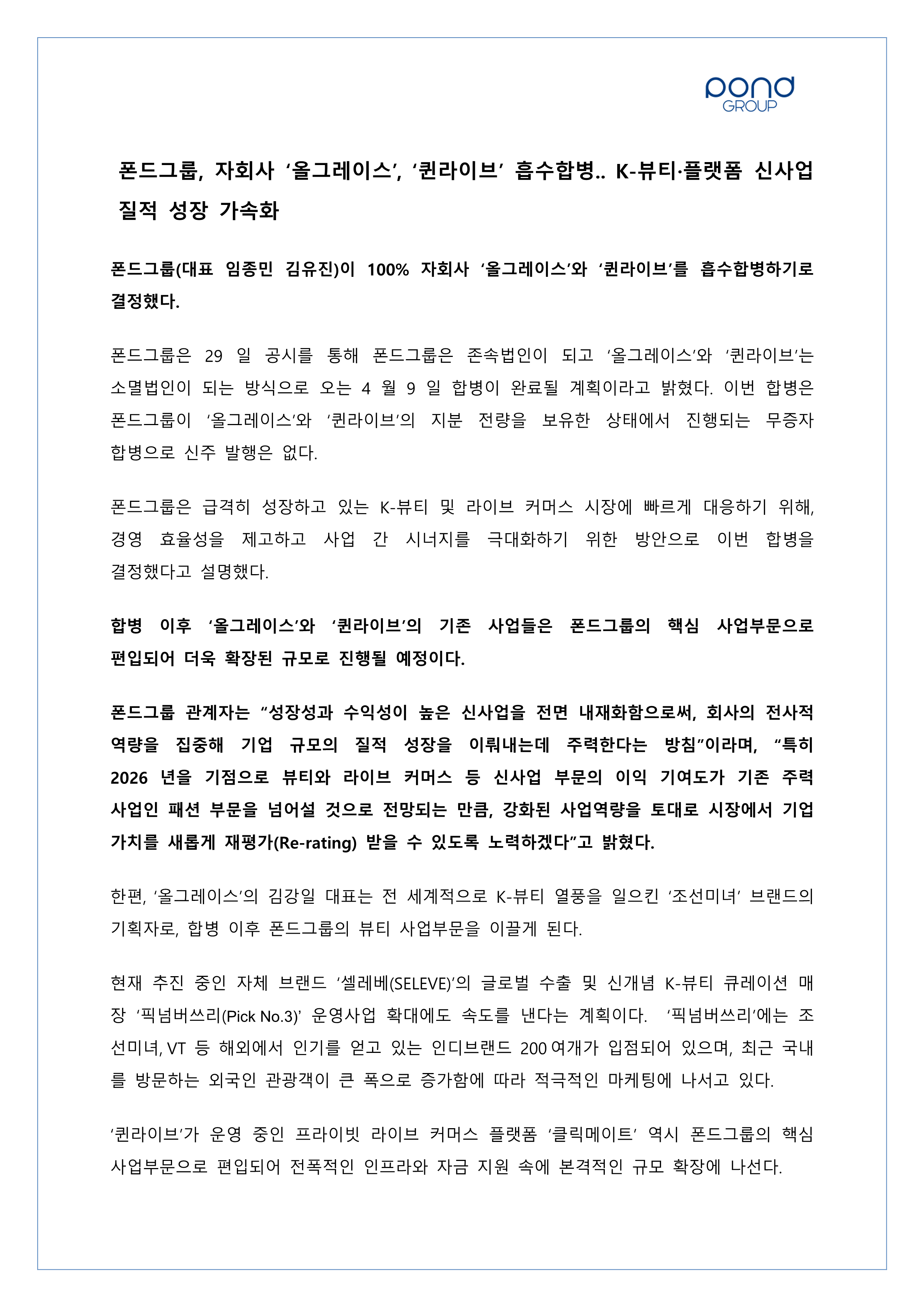 [폰드그룹] 자회사 ‘올그레이스’, ‘퀸라이브’ 흡수합병.. K-뷰티·플랫폼 신사업 질적 성장 가속화