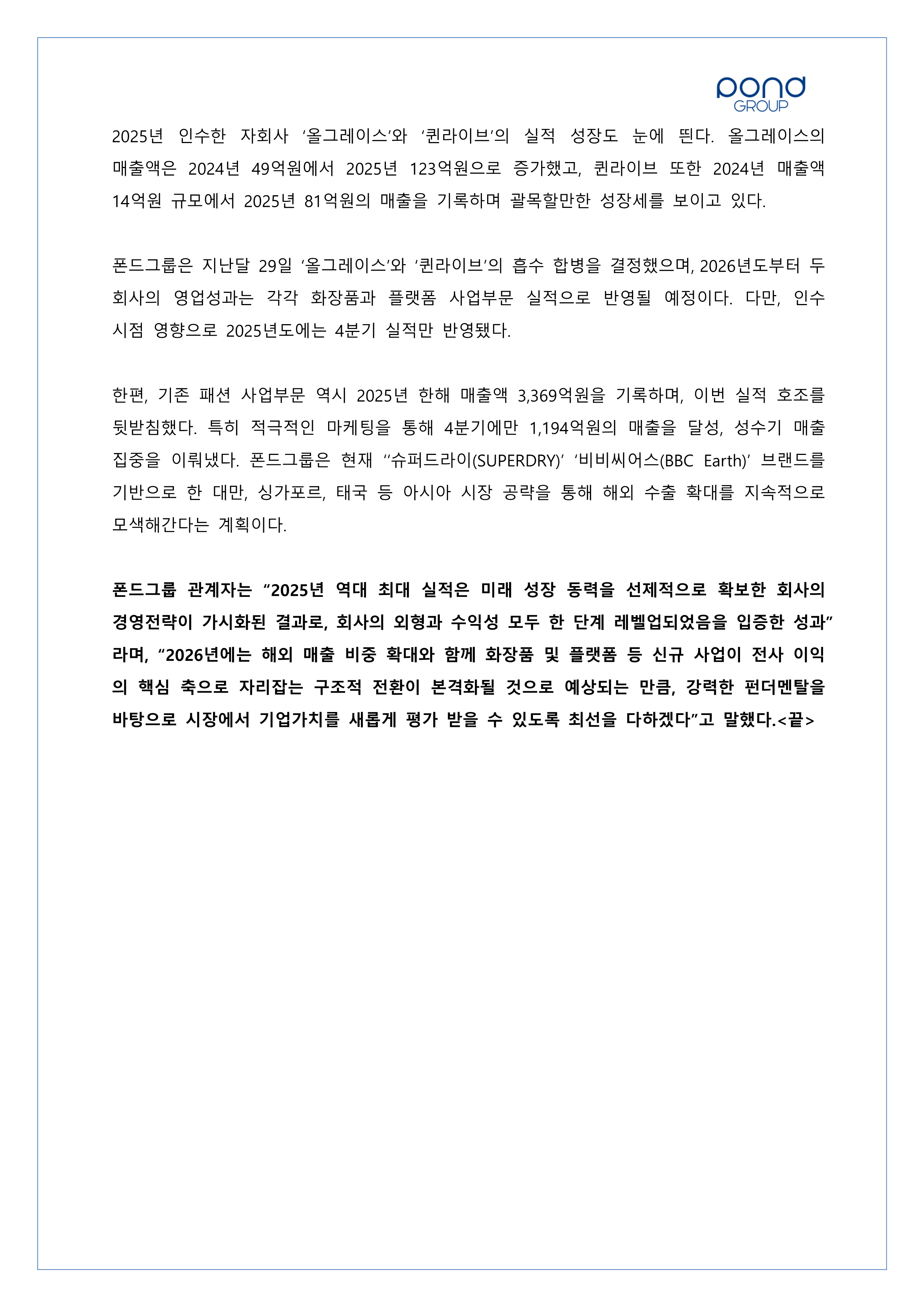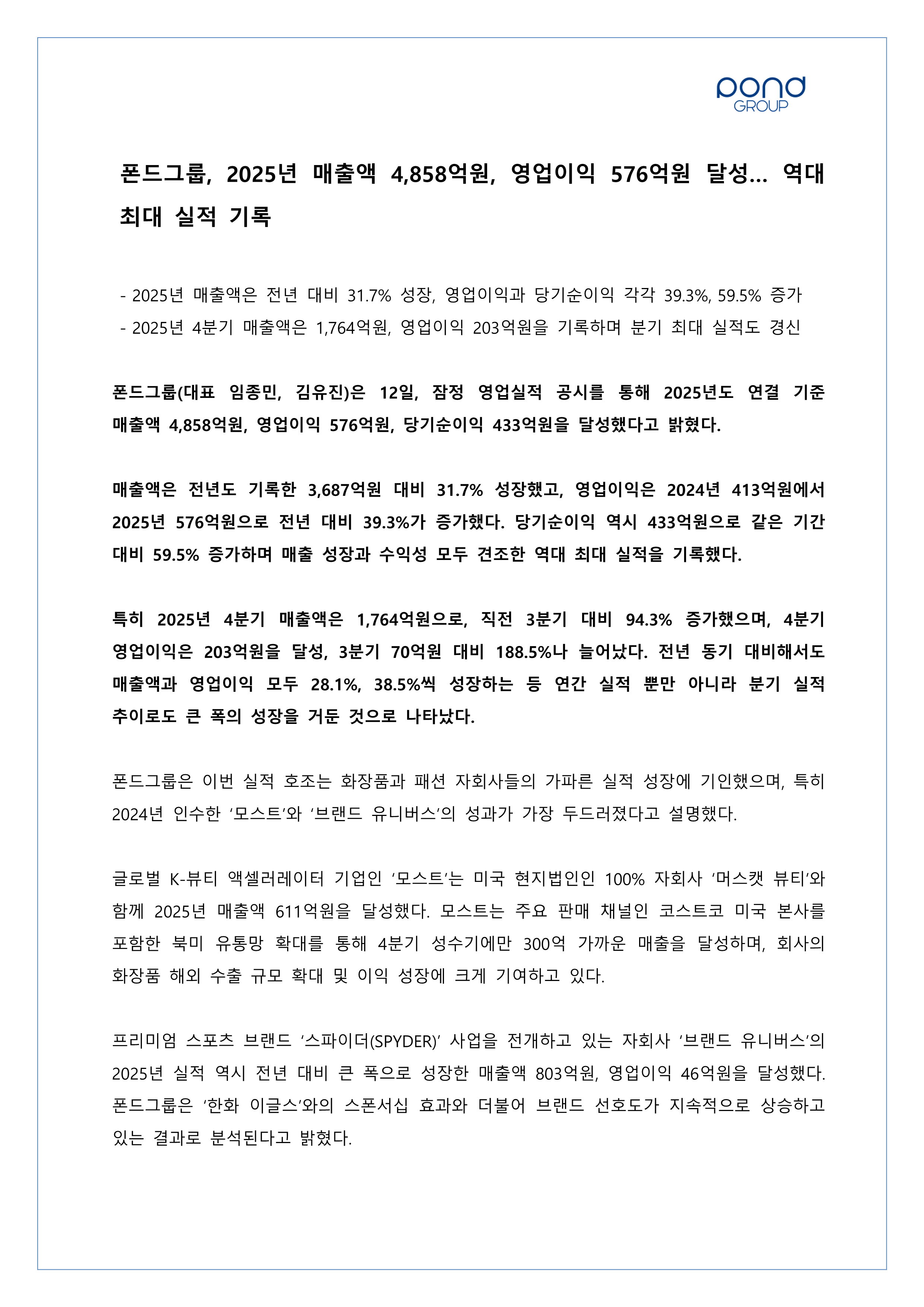 [폰드그룹] 2025년 매출액 4,858억원, 영업이익 576억원 달성… 역대 최대 실적 기록