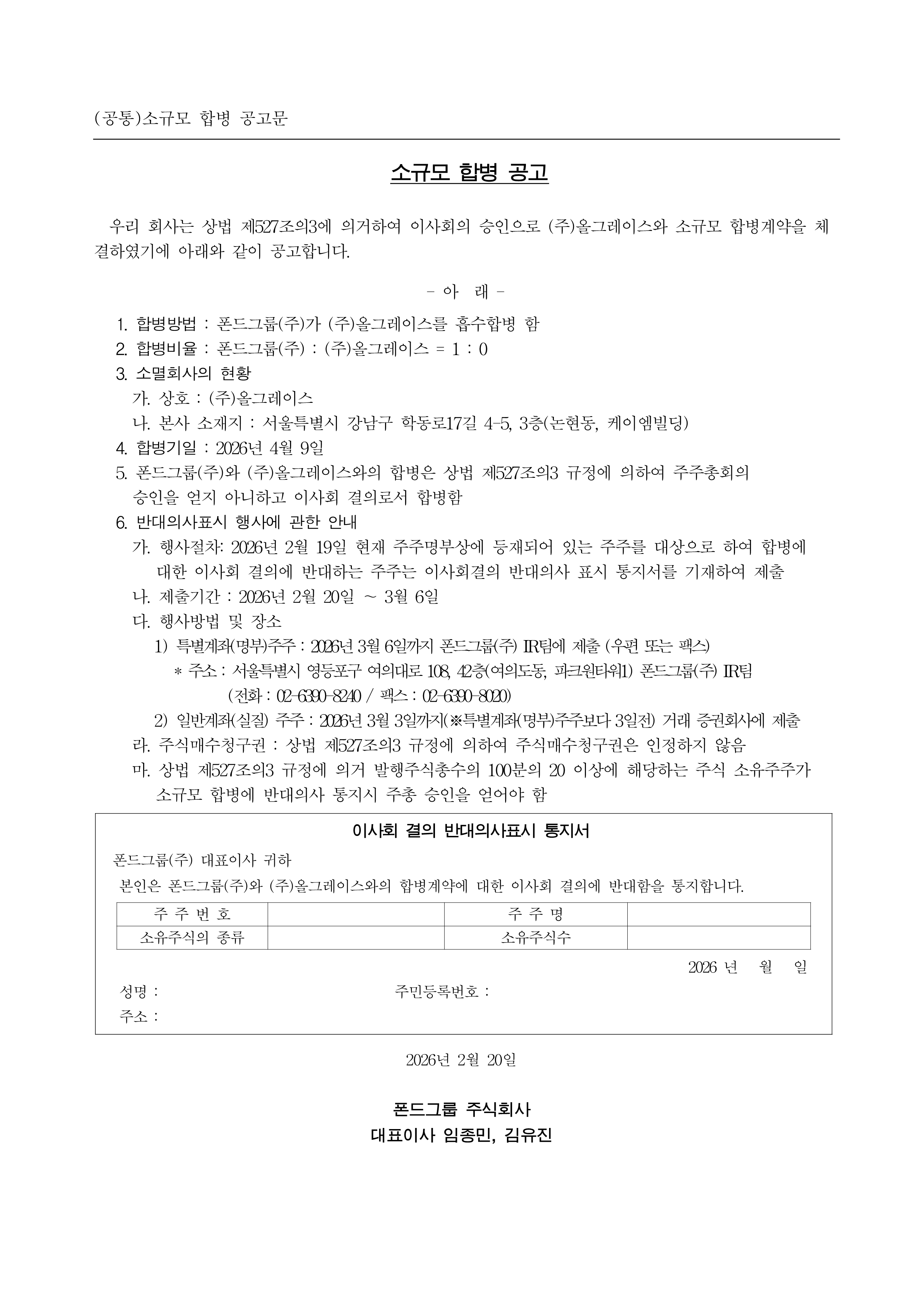 [폰드그룹-퀸라이브] 소규모합병 공고
